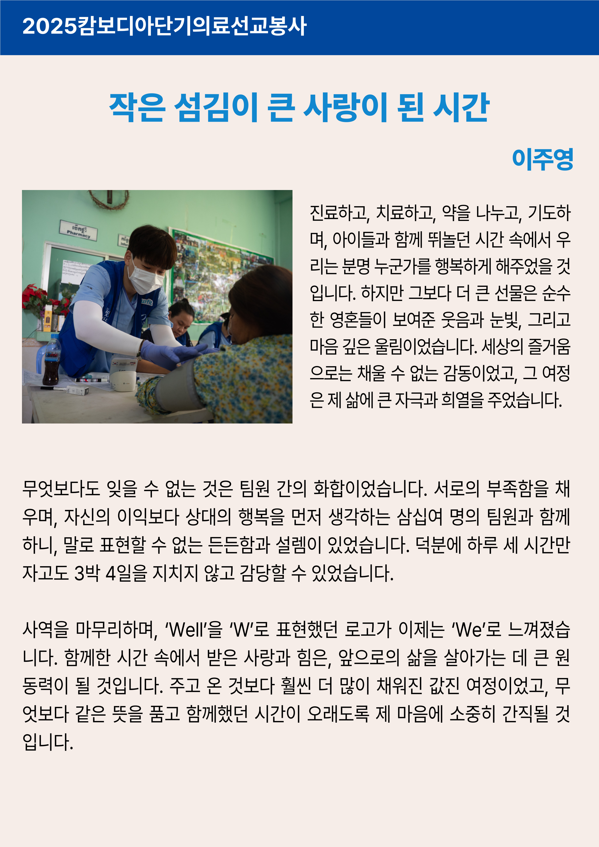 ¿ÃÇØ ¿©¸§, ¡°¸¹Àº ±â»ÝÀ» ÁÖ°í ¿ÀÀÚ¡±´Â ´ÙÁüÀ¸·Î įº¸µð¾Æ ´Ü±â ÀÇ·á¼±±³¸¦ ´Ù³à¿Ô½À´Ï´Ù. ºñ·Ï ªÀº ½Ã°£À̾úÁö¸¸, ±× ¾È¿¡¼ ¿ì¸®´Â ³ª´®ÀÌ ¾ó¸¶³ª Å« »ç¶ûÀÌ µÇ´ÂÁö¸¦ ±íÀÌ ¹è¿ü½À´Ï´Ù. Áø·áÇϰí, ¾àÀ» ³ª´©°í, ¾ÆÀ̵é°ú ÇÔ²² ¶Ù³î¸ç ¿ôÀ» ¶§¸¶´Ù ¿ì¸®º¸´Ù ÈξÀ ´õ ¸¹Àº °ÍÀ» Áֽô Çϳª´ÔÀ» ´À³¥ ¼ö ÀÖ¾ú½À´Ï´Ù. ÀÇ·á ºÀ»ç¿´Áö¸¸, ±×°÷¿¡¼ ¸¶ÁÖÇÑ È¯ÇÑ ¹Ì¼Ò¿Í µû¶æÇÑ ´«ºûÀº ¿ÀÈ÷·Á ¿ì¸®ÀÇ ¸¶À½À» Ä¡À¯Çß½À´Ï´Ù. ¾ð¾î´Â ÅëÇÏÁö ¾Ê¾Æµµ, ¼ÕÀ» Àâ¾ÆÁÖ´Â ¼ø°£ ¸¶À½ÀÌ ÅëÇß½À´Ï´Ù. ¼·ÎÀÇ ºÎÁ·ÇÔÀ» ä¿öÁÖ¸ç ³¡±îÁö ¼¶±ä ÆÀ¿øµéÀÇ ¸ð½ÀÀº ¡°WELL¡±À̶ó´Â À̸§ ±×´ë·Î, »ç¶û°ú ºûÀÇ »ù¹°ÀÌ µÇ¾î Èê·¯°¬½À´Ï´Ù. ÀÌ ½Ã°£Àº ´Ü¼øÇÑ ºÀ»ç°¡ ¾Æ´Ï¶ó, ¡®³»°¡ °¡Áø ½Ã°£°ú ¸¶À½À» ¿ÂÀüÈ÷ µå¸± ¶§ ±×ºÐÀÇ »ç¶ûÀÌ ¾ó¸¶³ª dz¼ºÇÏ°Ô Èê·¯°¡´ÂÁö¡¯¸¦ ±ú´Ý´Â ¿©Á¤À̾ú½À´Ï´Ù. µ¹¾Æ¿Â Áö±Ýµµ, ±× ¿ôÀ½°ú ´«ºûÀÌ ¿©ÀüÈ÷ ¸¶À½À» ¿ï¸³´Ï´Ù. We served. We received. We were loved. ±×°÷¿¡¼ ³ª´« »ç¶ûÀÌ ¿ì¸®ÀÇ ÀÏ»ó ¼Ó¿¡¼µµ °è¼Ó À̾îÁö±æ ¼Ò¸ÁÇÕ´Ï´Ù. |